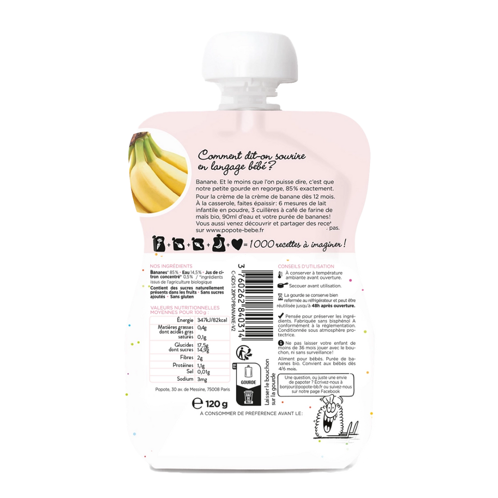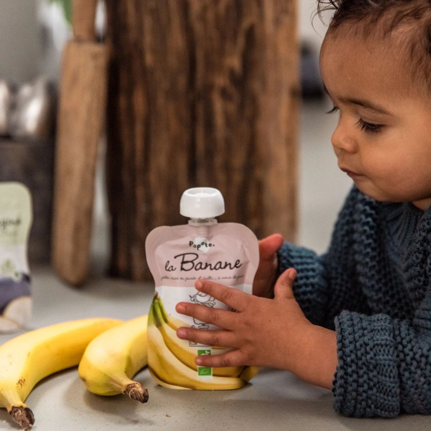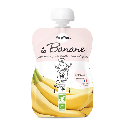 La compote de banane Popote est 100% bio et définitivement élue meilleure compote ever par tous les -parents- bébés. La version nomade du petit pot de banane pour bébé !