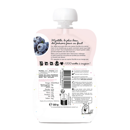 Le vrai goût de la myrtille, sans compromis. On ne sait pas qui des parents ou des bébés vont le plus apprécier ! Popote vous accompagne avec des gourdes mono-ingrédients à mélanger selon vos envies. La version nomade du petit pot pour bébé ! Pour twister cette gourde de myrtilles, vous pouvez la mélanger avec du fromage blanc nature.