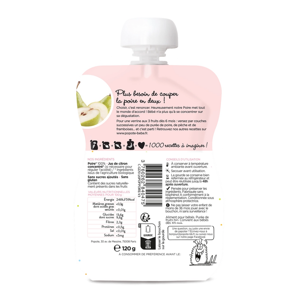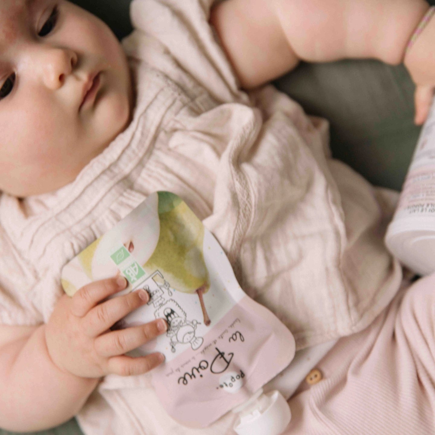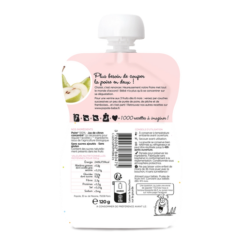 Dans notre gourde de poire il y a... de la poire et quelques gouttes de jus de citron bio. Et c'est tout. Sans aucun doute la meilleure des compotes de poire pour bébé. Le meilleur des ingrédients, pour faire goûter à Bébé le vrai bon goût du fruit.