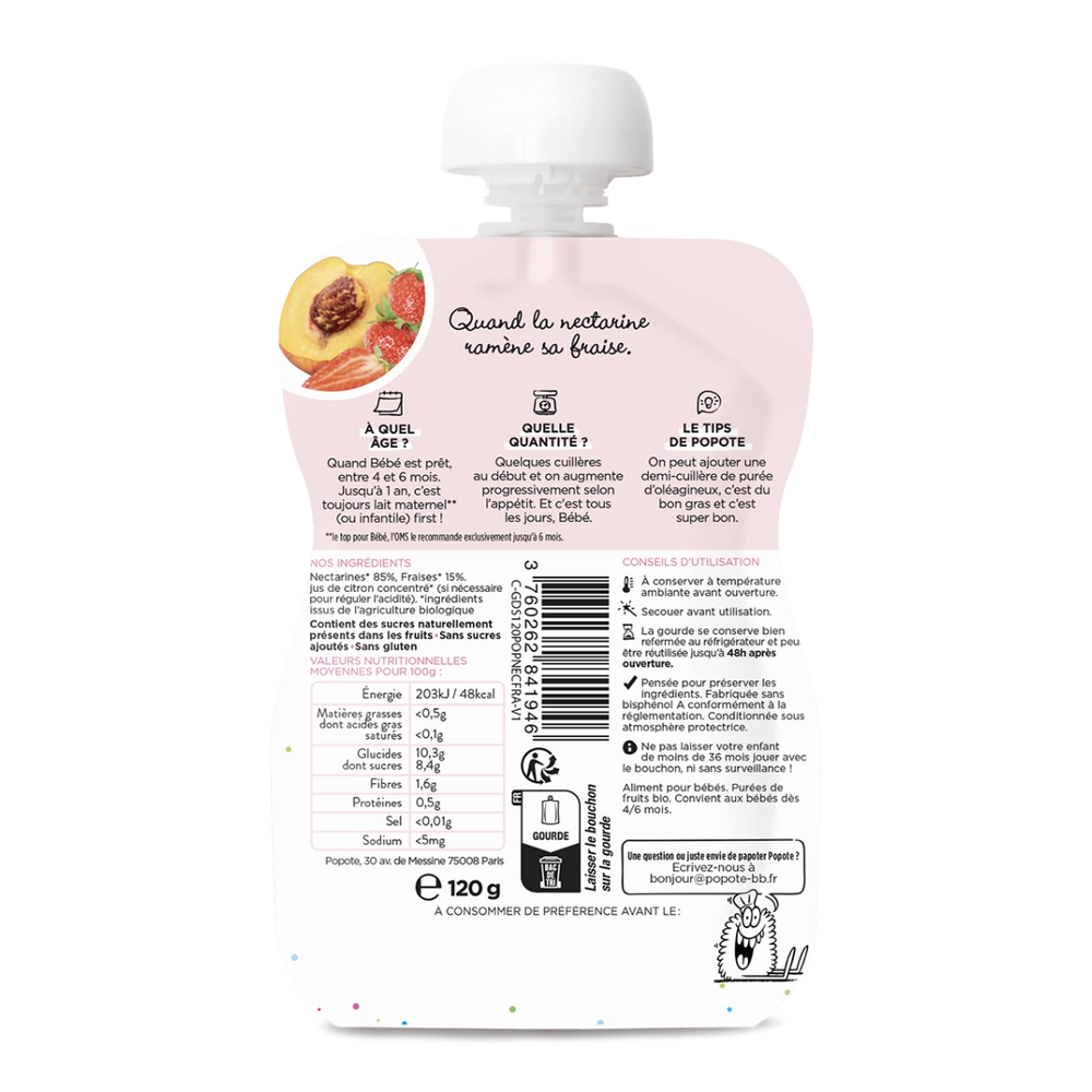 Une délicieuse compote de nectarines et de fraises bio, sélectionnées, cuites et mixées, pour régaler les petits bidons. Bébé va en redemander !