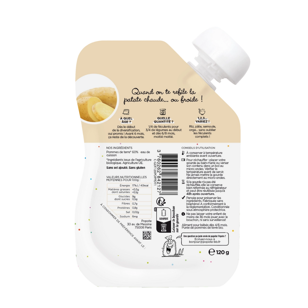 La star des féculents fait son entrée dans l’assiette de Bébé ! Douce et rassasiante, la purée de pomme de terre Popote est parfaite dès le début de la diversification alimentaire.