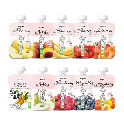 De savoureuses compotes pour bébé de pomme, pêche, banane, fraises, abricot, mûres banane, poire, framboises, myrtilles et mirabelles, qui sont parfaites pour lui faire découvrir le vrai goût de chaque ingrédient pendant la diversification l'alimentation. Dès 4/6 mois... ou pour les plus grands qui veulent des gourdes de compotes de fruit en vadrouille !