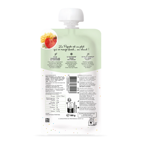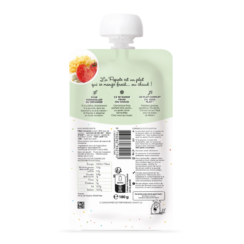 Alors on vous présente notre tout nouveau plat complet pour bébé. Une recette savoureuse avec des macaronis fondants, de la tomate mijotée, de la féta crémeuse pour la gourmandise et une touche d’huile de colza … le tout dans une texture lisse, parfaite pour les premières cuillères dès 6 mois. Ce plat complet contient tout ce qu’il faut pour faire un vrai repas du midi ou du soir.