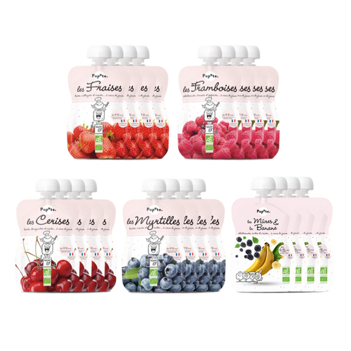 Pour vous faire découvrir - à vous et à Bébé - nos délicieuses gourdes bébé Popote. Nous avons rassemblé dans ce pack les fruits rouges nos meilleures compotes : 4 fraises, 4 framboises, 4 cerises, 4 myrtilles et 4 mûres banane.