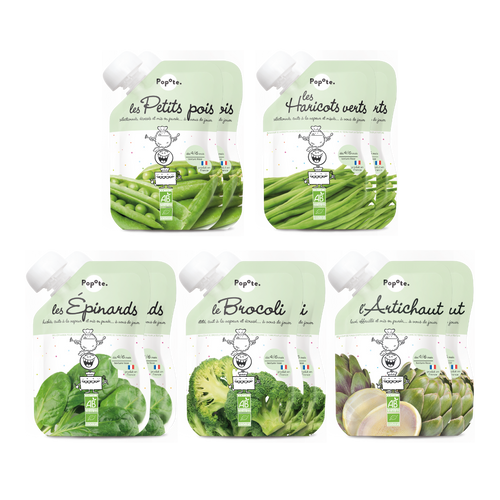 Pour vous faire découvrir - à vous et à Bébé - nos délicieuses gourdes bébé Popote. Nous avons rassemblé dans ce pack les légumes verts nos meilleures purées : petits pois, haricots verts, épinards, brocoli et artichaut.