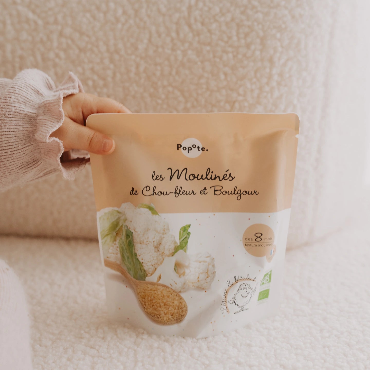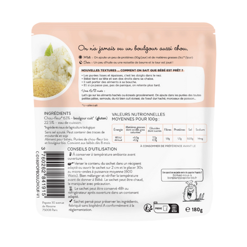 Pour vous accompagner quand Bébé grandit et vous proposer de nouvelles textures, Popote présente son Chou-fleur et Boulgour 100% bio, cuits et moulinés. Idéal dès 8 mois. Pour le déj' ou pour le dîner, les petits bidons n'ont plus qu'à se régaler ! Le midi, on oublie pas d'ajouter un peu de protéines, viandes, poissons ou oeufs (à 8 mois c'est 10g par jour) et une petite cuillère d'huile (1 cuillère à café par jour) ou une noisette de beurre de temps en temps. Le soir, on ajoute des matières grasses dans sa purée moulinée si il n'en pas eu le midi, et le tour est joué. On ouvre le sachet, on le met au micro-ondes et hop direction l'estomac de Bébé.