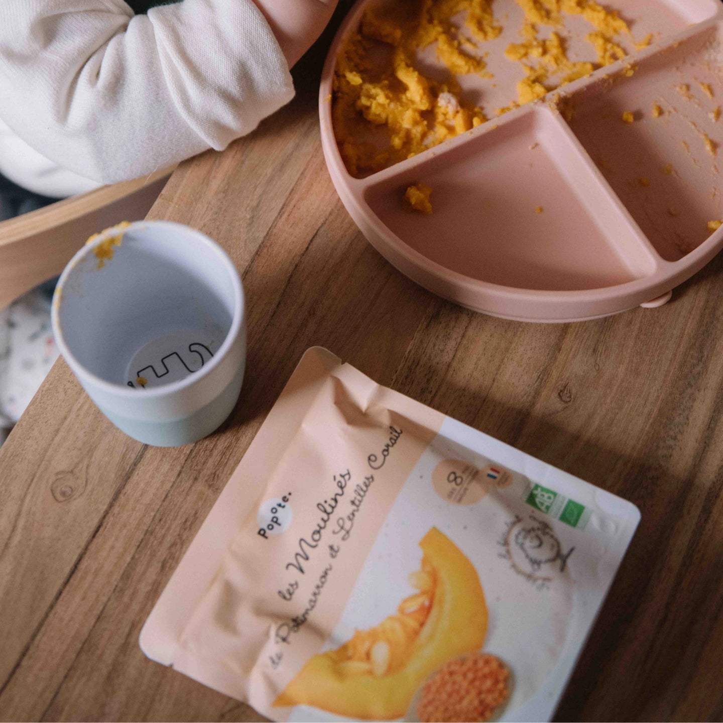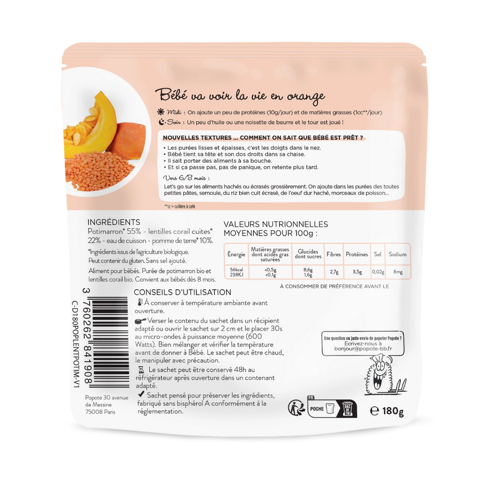 On a imaginé des purées à la texture moulinée pour démarrer l'introduction des textures avec Bébé dès 8 mois. Du Potimarron bio et des Lentilles corail bio, cuits et hâchés… au top pour lui proposer des nouvelles textures, et en plus il va se régaler. Le midi, on ajoute un peu de protéines, viandes, poissons ou oeufs (à 8 mois c'est 10g par jour) et une petite cuillère d'huile (1 cuillère à café par jour) ou une noisette de beurre de temps en temps. Le soir, on ajoute des matières grasses dans sa purée moulinée si il n'en pas eu le midi, et le tour est joué. On ouvre le sachet, on le met au micro-ondes et hop direction l'estomac de Bébé.