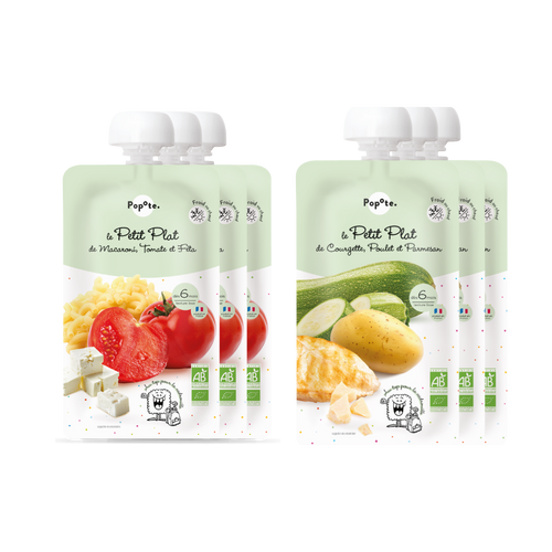 Le pack petits plats complets pour Bébé dès 6 mois : 3 Macaroni, Tomate et Féta, 3 Courgette, Poulet et parmesan