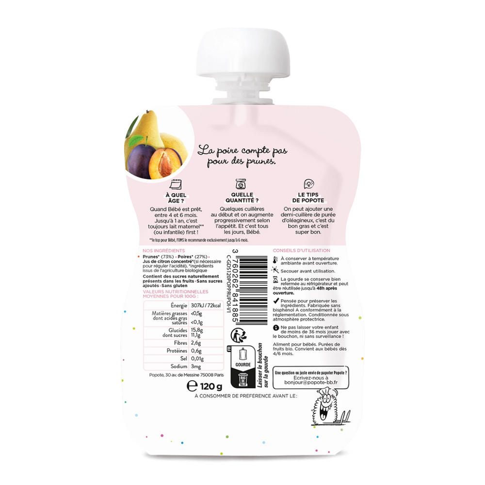 Y'en a qui préfèrent les poires, d'autres les prunes... alors pour mettre tout le monde d'accord, on a préparé une délicieuse purée avec les deux fruits, prête à régaler Bébé. Vous pouvez lui faire goûter dès ses 4/6 mois, quand Bébé est prêt, pour attaquer la diversification ou quand Bébé aura grandi et mangera des petits pots de compotes bi-fruits.