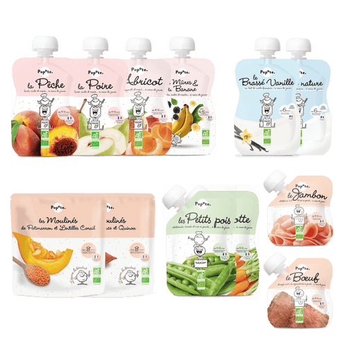 Pour le repas, faites lui découvrir nos Popote de Petits Pois, Carotte, Boeuf, Jambon nos Moulinés Potimarron et lentilles corail et Patate douce et Quinoa.