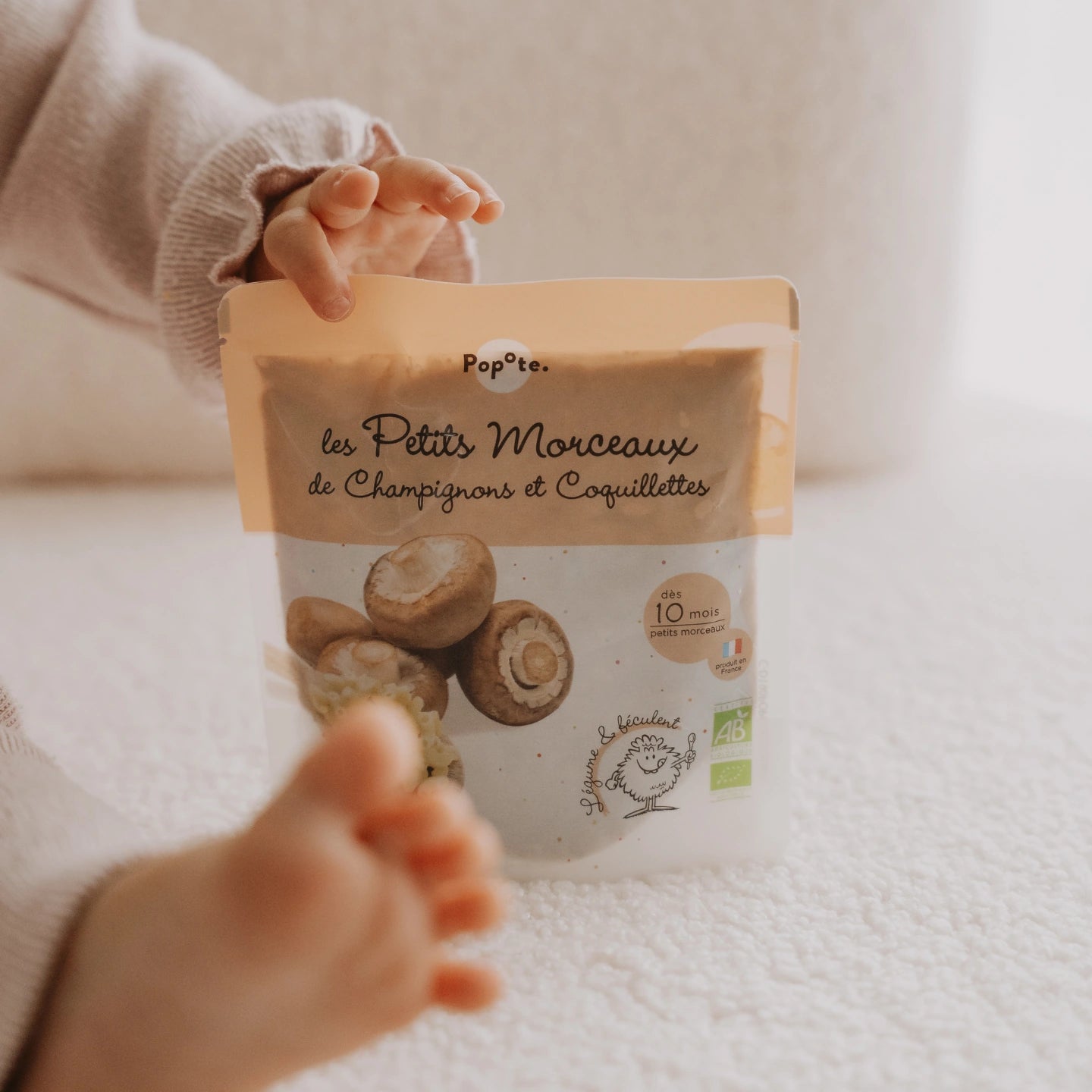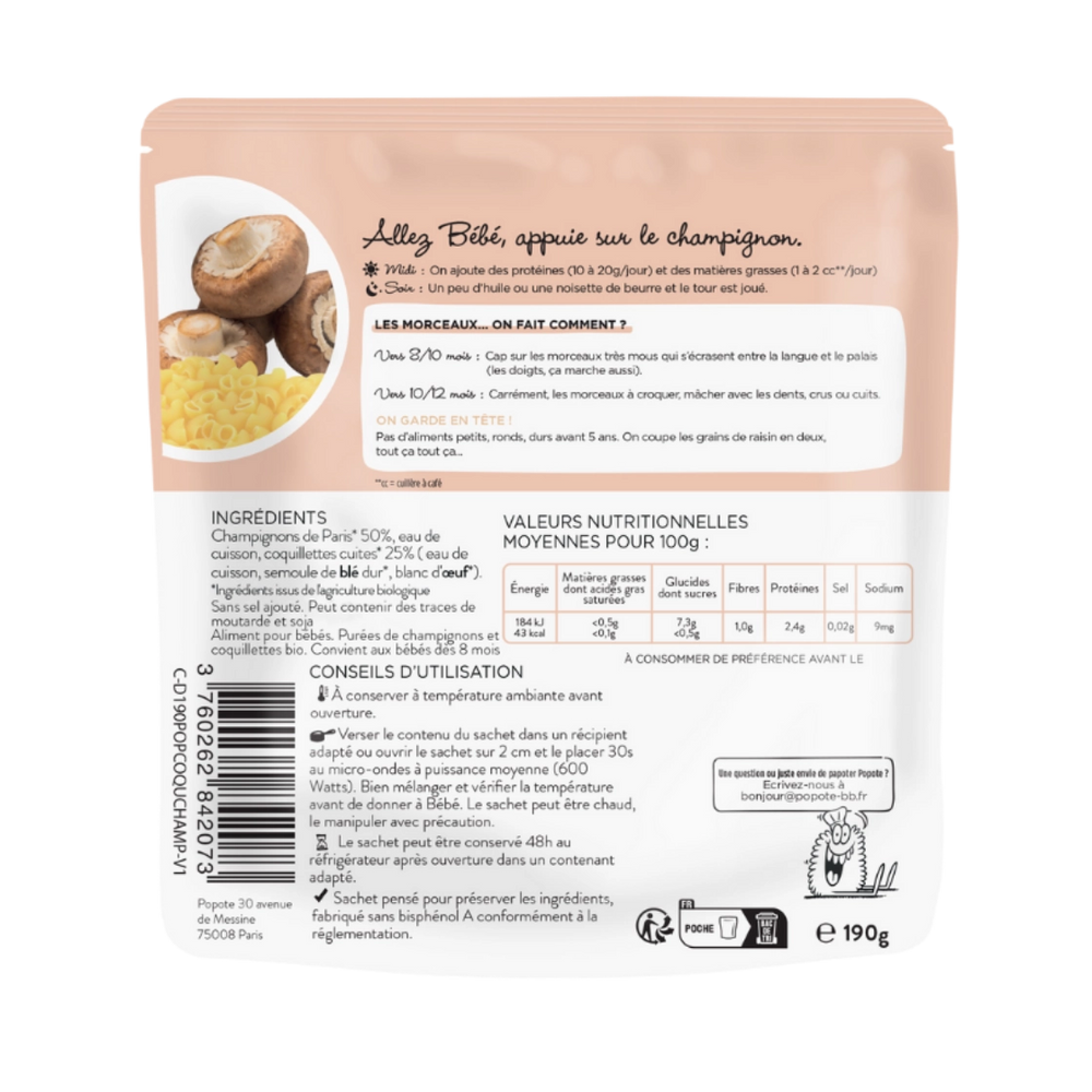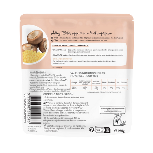 Découvrez notre mélange légumes/féculents : Champignons et Coquillettes ! Des ingrédients issus de l'agriculture biologique, cuits, moulinés et préparés avec soin en France. Un repas délicieux qui régalera Bébé et qui lui permettra de découvrir de nouvelles textures : des petits morceaux dès l'âge de 10 mois. Le midi, on peut compléter la Popote avec un peu de protéines comme de la viande, poisson ou œufs (entre 10 et 20g/jour) et 1 à 2 cuillères à café de matières grasses par jour. Ou une noisette de beurre le soir s'il n'en a pas eu le midi. Tout simplement ! On verse le contenu du sachet dans un récipient adapté, on le met 30 secondes au micro-ondes et hop, direction le bidon de Bébé !