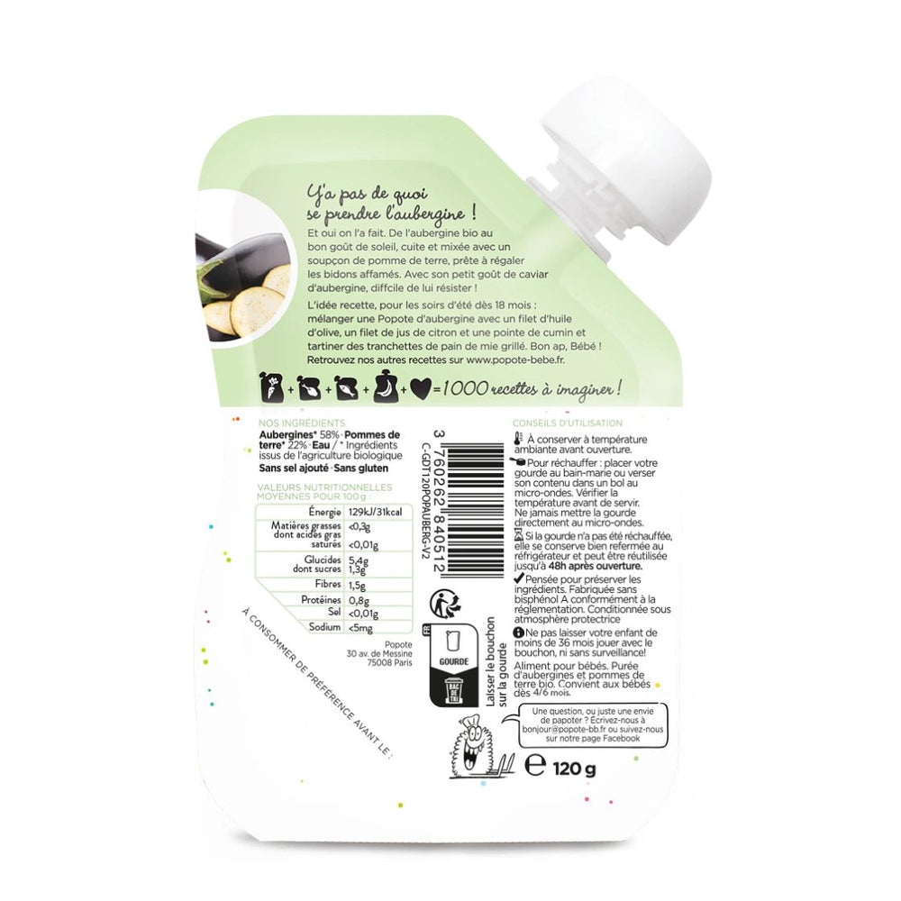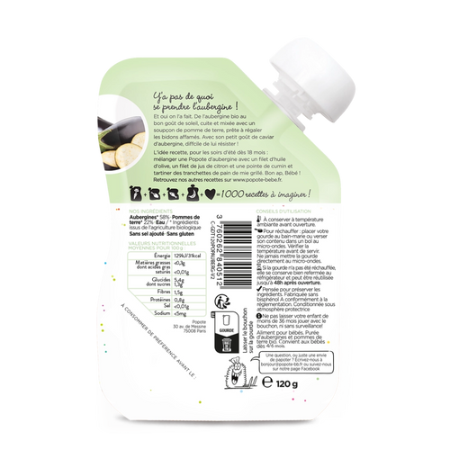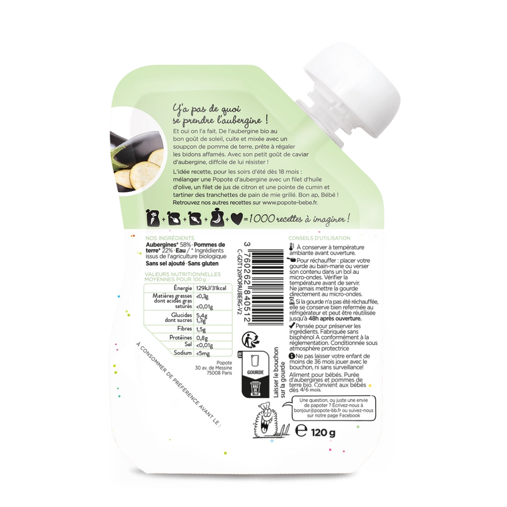 - Si cette gourde de purée d'aubergine pour bébé n'a pas été réchauffée, elle se conserve à température ambiante et jusqu'à 48 heures au réfrigérateur après ouverture. Portionnable, refermable, elle peut être réutilisée sous condition de conservation hygiénique.