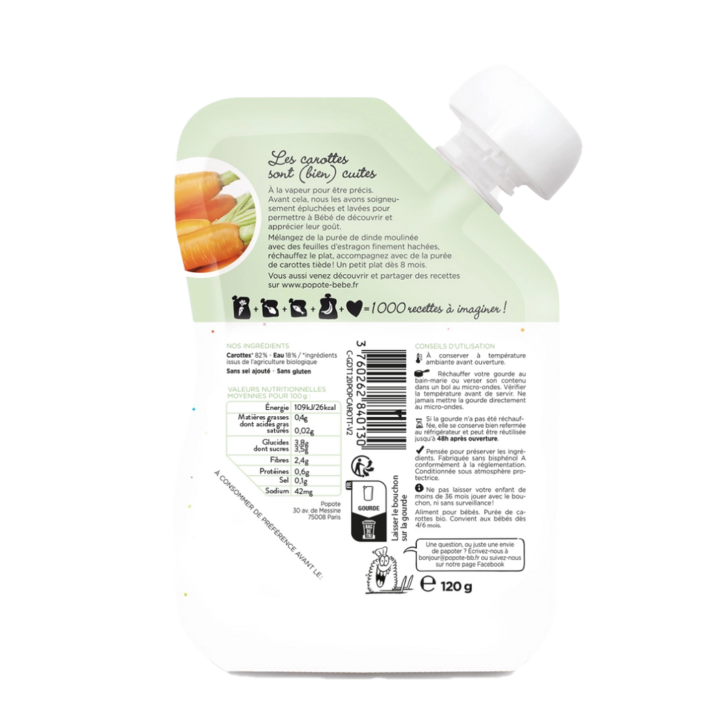 Chez Popote on a opté pour une cuisson lente à la vapeur pour conserver tous les bons nutriments présents naturellement dans ce légume. On mixe ensuite cette purée et le tour est joué ! Vous voilà en possession d'une purée de carotte pour Bébé dès 4 mois, à vous de jouer pour préparer des menus sur mesure à votre petit dernier.