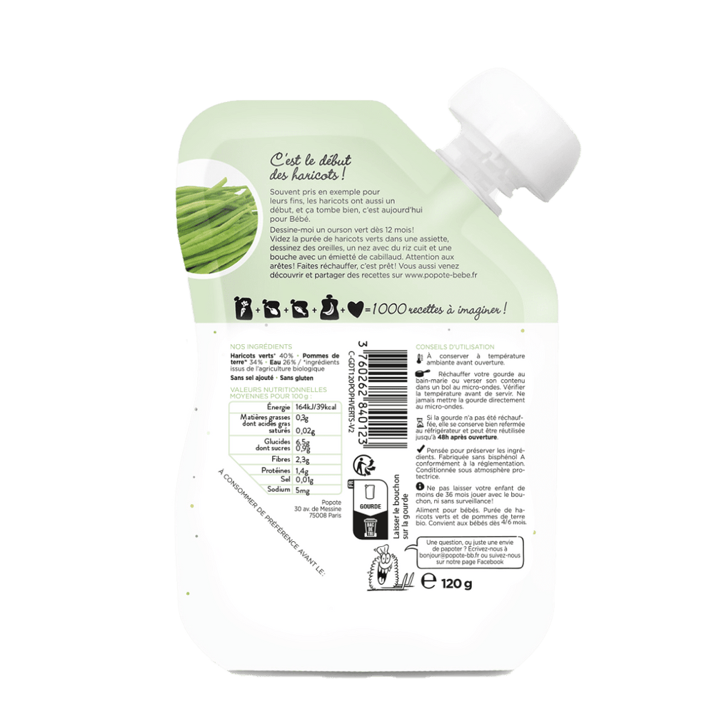 C'est pourquoi chez Popote on a décidé de vous proposer une purée 100% bio lisse facile à matcher avec d'autres saveurs. Comme un petit pot de purée de haricots verts pour Bébé… mais en format gourde, absolument parfait pour les Bébés vadrouilleurs! Et pour faire goûter à bébé le goût de cette purée tout en douceur, proposez lui un petit bouillon only for babies. Un avant goût qui lui permettra certainement de plus l'apprécier plus tard. Toutes nos Popote sont garanties bio et surtout sans conservateurs ni additifs, que du bon.