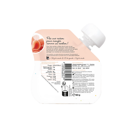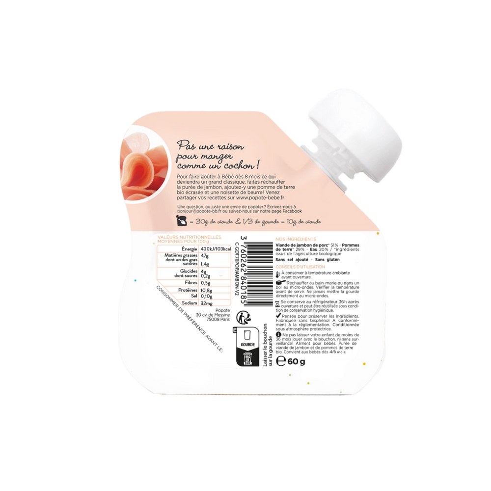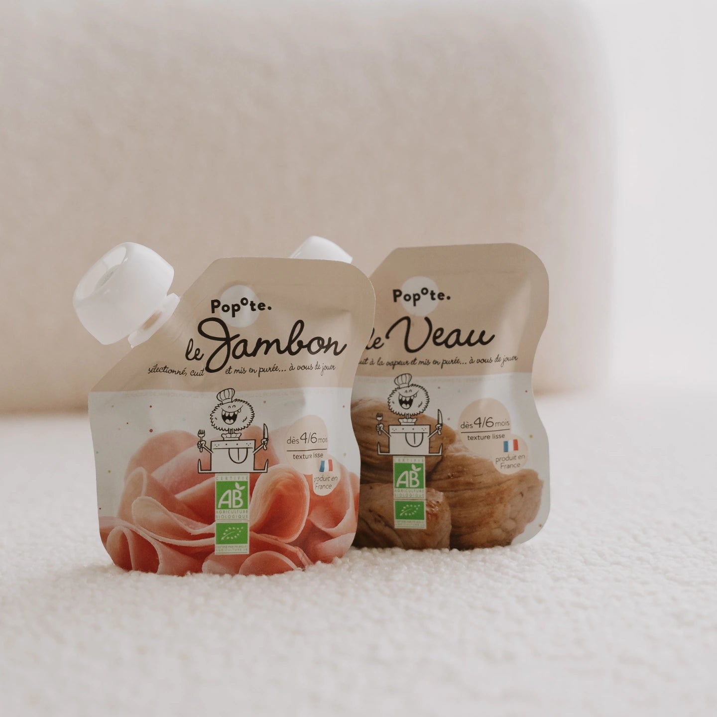 C'est pourquoi Popote a imaginé une purée de jambon blanc pour faire profiter Bébé de ce plat réconfortant à souhait. Facile à intégrer dans la diversification alimentaire de Bébé dès 4/6 mois, le jambon est simplement cuit à la vapeur et mixé pour obtenir une texture moulinée qui titillera ses papilles.
