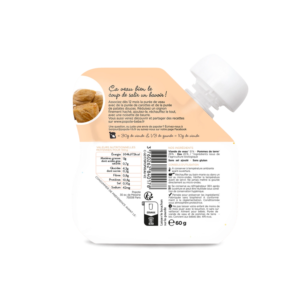 Pour varier les plaisirs durant l'intégration des protéines dans diversification alimentaire de Bébé dès ses 4/6 mois, hop on attrape une Popote de veau et on innove pour lui proposer des recettes adaptées et originales. Popote vous facilite la tâche en préparant le veau en amont. Avec une cuisson lente à la vapeur, la viande garde tous ses bienfaits. On ajoute un peu de purée de pomme de terre pour la texture. Et... C'est tout !